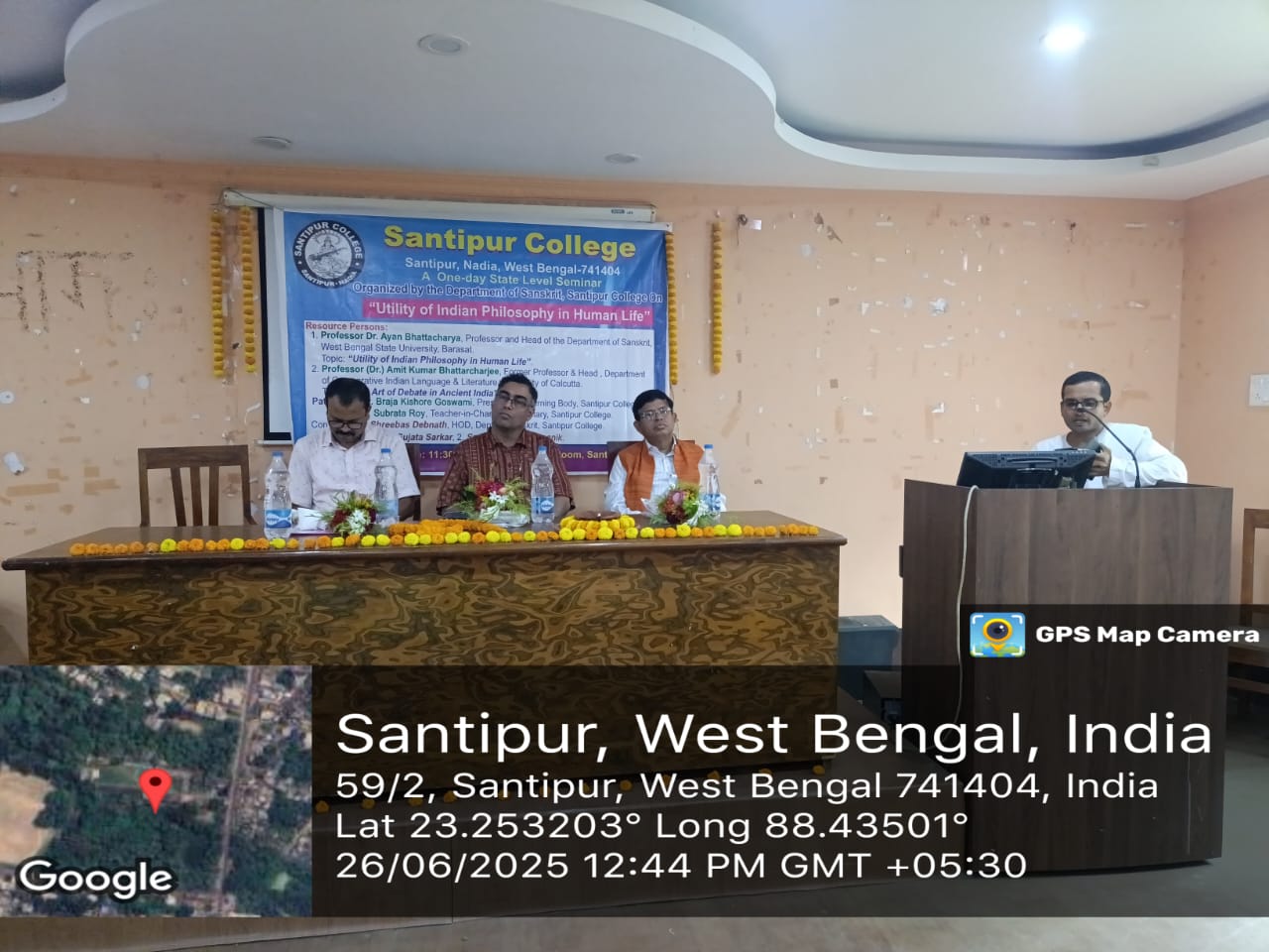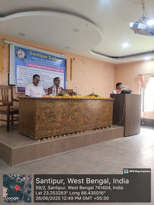 One day State Level Seminar | Dr. Ayan Bhattacharya, Head of the Department of Sanskrit, West Bengal State University, Barasat . | Topic: Utility of Indian Philosophy in Human Life. Jointly organized by the Department of Sanskrit in association with IQAC, Santipur College. A Report : View |