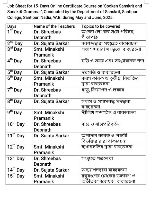 | May and June, 2025 | 15 Days Online Certificate Course | Dr. Shreebash Debnath, Assistant Professor and HOD, Department of Sanskrit, Santipur College. Dr. Sujata Sarkar, Assistant Professor, Department of Sanskrit, Santipur College. Smt Minakshi Pramanick, SACT, Department of Sanskrit, Santipur College. 15 Participants |