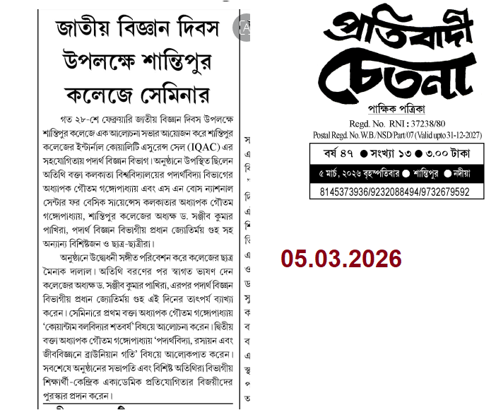 | 3 td > | 05.03.2026 | National Science Day celebration (Department of Physics, Santipur College) | Pratibadi Chetana | View/Download |
