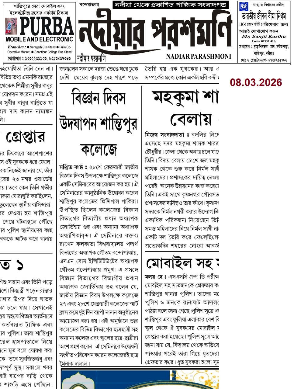 | 9 td > | 08.01.2026 | On Santipur College | Anandabazar Patrika Nadia page | View/Download |