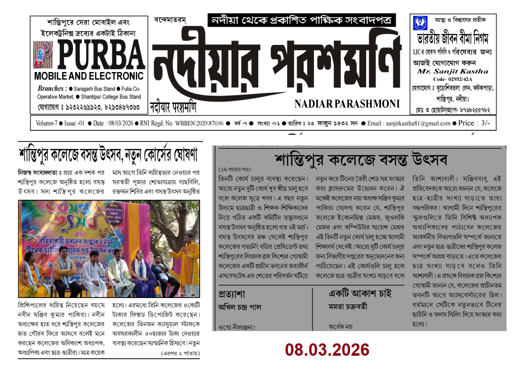 | 1 td > | 08.03.2026 | Basanta Utsov Celebration, Santipur College | Nadia r Poroshmoni | View/Download |